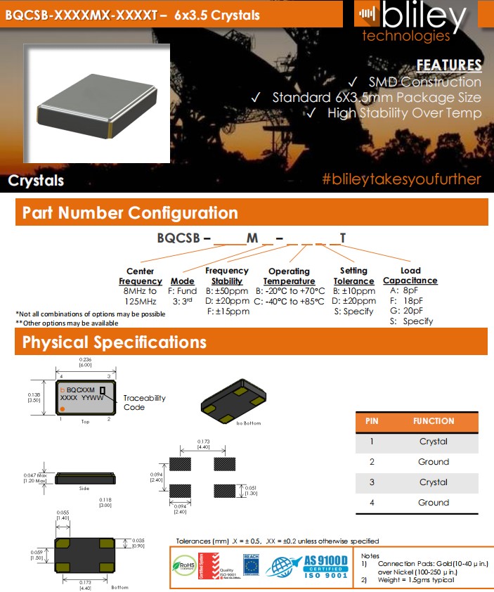 百利Bliley晶振,6G路由器晶振,BQCSB-38.400MF-BCDGT石英晶振,美國Bliley晶振公司,歐美進(jìn)口晶振,百利晶振,高品質(zhì)晶振,歐美晶振,6035晶振,四腳晶振,貼片晶振,石英晶振,6G通訊設(shè)備晶振,高精度儀器晶振,6G以太網(wǎng)晶振,無源晶振,SMD封裝,標(biāo)準(zhǔn)6X3.5mm包裝尺寸,高溫下高穩(wěn)定性