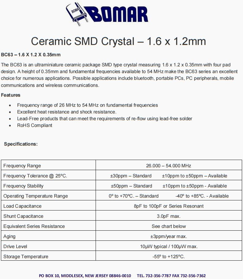 Bomar無源晶振,BC41EFD120-37.400000四腳晶振,無人機信號接收器晶振,美國Bomar晶振公司,進口晶振,歐美晶振,BC63晶振,1612晶振,石英晶振,超小型晶振,無源晶振,貼片晶振,四腳晶振,6G路由器晶振,6G通訊設備晶振,BC63是一款尺寸為1.6 x 1.2 x 0.35mm的超微型陶瓷封裝SMD型晶體,采用四焊片設計。0.35mm的高度和54 MHz的基頻使BC63系列成為眾多應用的絕佳選擇。可能的應用包括藍牙、便攜式個人電腦、個人電腦外圍設備、移動通信和無線通信