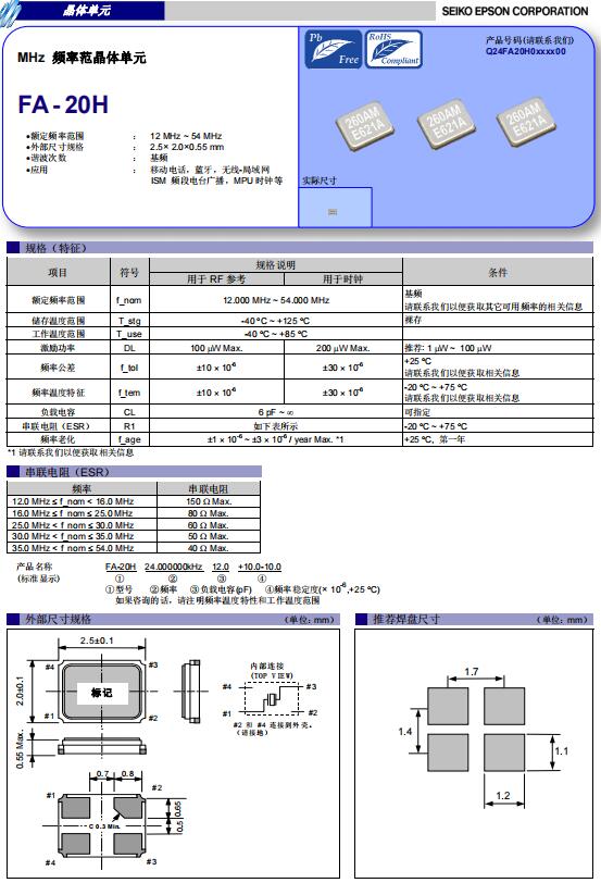 | Q24FA20H00139 | 2.5 x 2 x 0.55mm | FA-20H | 30.000000 MHz | 8 pF | -40 to +85 °C |