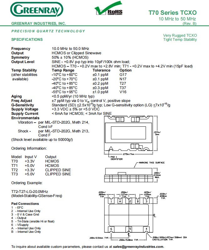 格林雷晶振,T70-N17-LG-10.0MHz-E溫補(bǔ)晶振,6G通訊衛(wèi)星晶振,美國Greenray晶振公司,歐美晶振,石英晶振,Greenray Industries的T70系列tcxo為移動(dòng),電池供電的應(yīng)用程序提供可靠,精確的性能。它已被開發(fā)為關(guān)鍵時(shí)序的參考振蕩器,需要嚴(yán)格的溫度穩(wěn)定性,低電源電流,非常堅(jiān)固的封裝,占地面積小。T70系列非常適合用于勘探和跟蹤設(shè)備應(yīng)用。特點(diǎn):小巧堅(jiān)固的7.0 x 5.0 mm封裝,可承受高達(dá)50,000 g的振動(dòng)和高沖擊,嚴(yán)格的溫度穩(wěn)定性低至±0.1ppm, 10年以上的長期老化< 5ppm,低加速靈敏度:< 0.7 ppb/g,低功耗,實(shí)現(xiàn)可靠的電池供電性能提升,低相位噪聲。應(yīng)用,電信,高沖擊電子,移動(dòng)無線電,移動(dòng)儀器,機(jī)載通信,無線通信,微波接收器,智能彈藥,貼片晶振,有源晶振,TCXO晶振,八腳晶振,高精度晶振,進(jìn)口晶振,6G無線通信晶振,品規(guī)格參數(shù)圖.jpg)