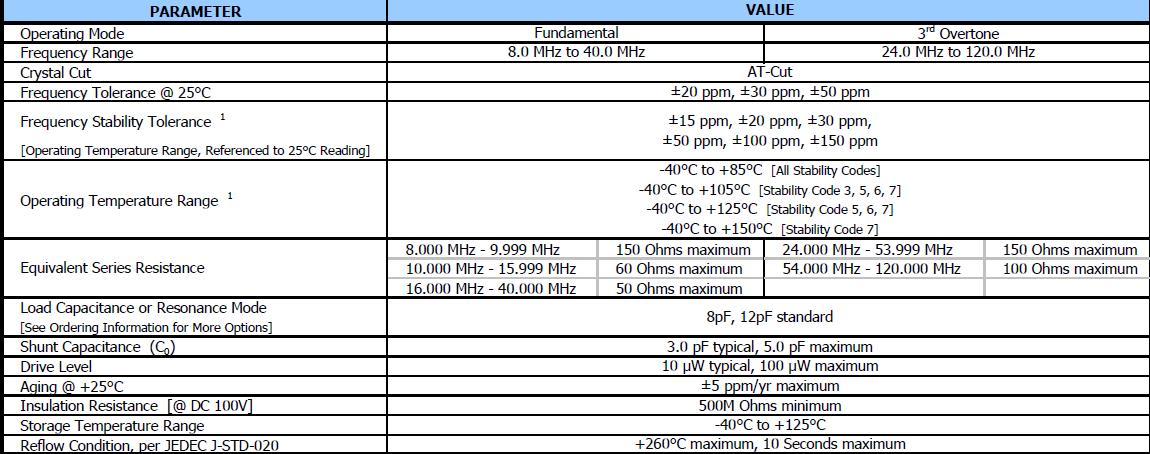 AEC-Q200兼容,標準5.0毫米x 3.2毫米玻璃密封包,基本晶體設計,頻率范圍8 - 40 MHz基本,24 - 120 MHz第三泛音頻率公差;±20 ppm,±30 ppm和±50 ppm,頻率穩定度、參考訂購信息,操作溫度,-40°C + 125°C標準,磁帶和卷軸包裝標準,eia - 481,通過無鉛認證符合歐盟指令2011/65 /歐盟,無鉛終止完成,豁免7(c)-我,電氣和電子元件含鉛玻璃(Pb).