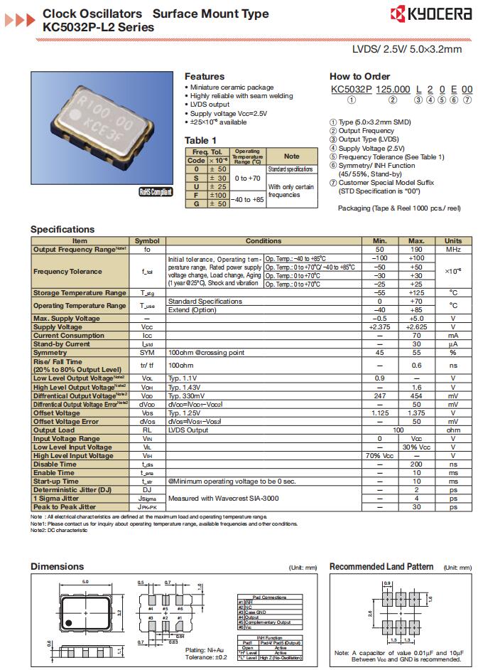 | KC5032A155.520C20E00 | AVX Corp/Kyocera Corp | KC5032A-C2 | 155.52MHz | 2.5V, 3.3V | -10°C ~ 70°C |
