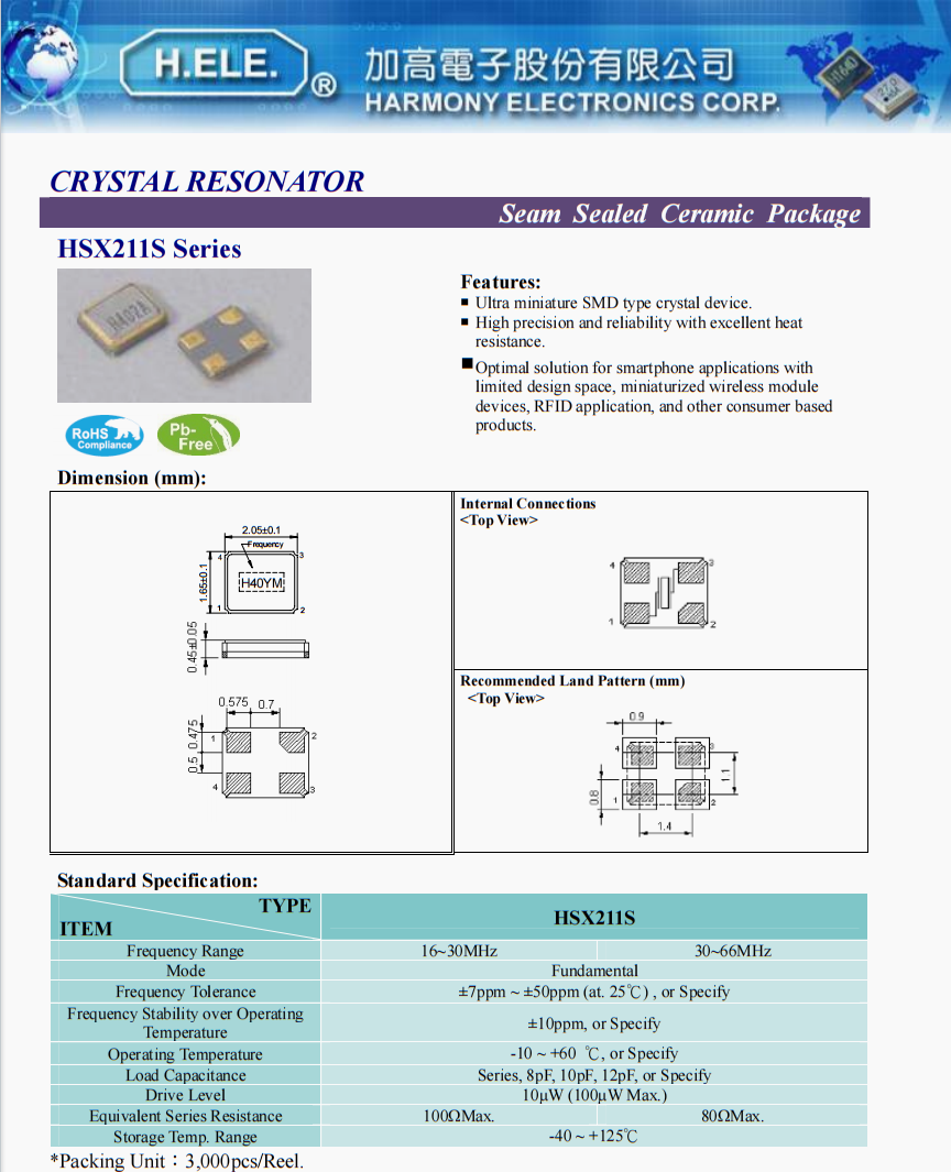 X2C026000BC1H-Z晶振,臺灣加高無源晶振,智能泊車系統晶振| 項目 | HSX211S |