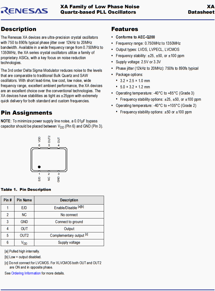 | XAL325033.333300K | Renesas晶振 | XA | 33.3333 MHz | LVDS | 2.5V | ±50ppm |