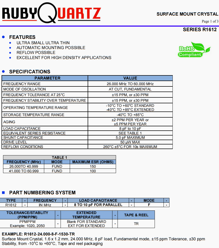 R1612-20.000-8-F-1530-TR晶振,rubyquartz超小型晶體,宇宙空間站晶振,美國rubyquartz晶振公司,高精度晶振,無源晶振,貼片晶振,高精度晶振,6G通訊設(shè)備晶振,無線傳輸晶振,局域網(wǎng)晶振,5032晶振,高品質(zhì)晶振,SMD晶振,石英晶振,小體積晶振,低損耗晶振 ,北斗衛(wèi)星定位模塊晶振,6G無線網(wǎng)晶振,高精度晶振。特點(diǎn):超小型超薄,可自動(dòng)安裝,可回流,適用于高密度應(yīng)用,應(yīng)用:尋呼機(jī),無繩電話,GPS,藍(lán)牙