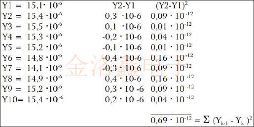 我們使用采樣速率J=1s立即連續(xù)執(zhí)行10次頻率比較測(cè)量Y=)f/f0=(f2-f1)/f0. 可以從具有不同采樣時(shí)間的幾次測(cè)量中執(zhí)行相同的評(píng)估.評(píng)估得出的圖形如上圖所示,當(dāng)然,要獲得可重復(fù)的值,需要進(jìn)行10次以上的測(cè)量.
