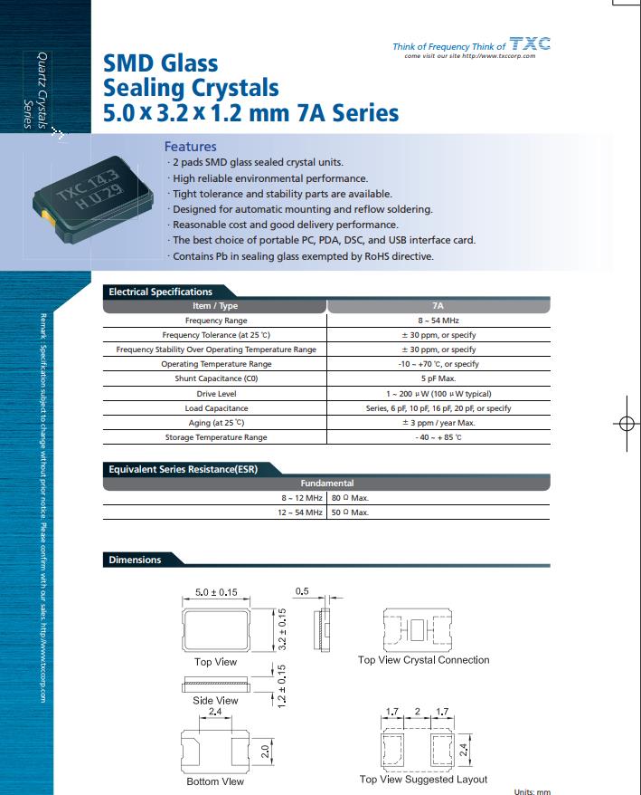 | 7A-20.000MAAJ-T | TXC晶振 | 7A | 20MHz | ±30ppm | -20°C ~ 70°C |