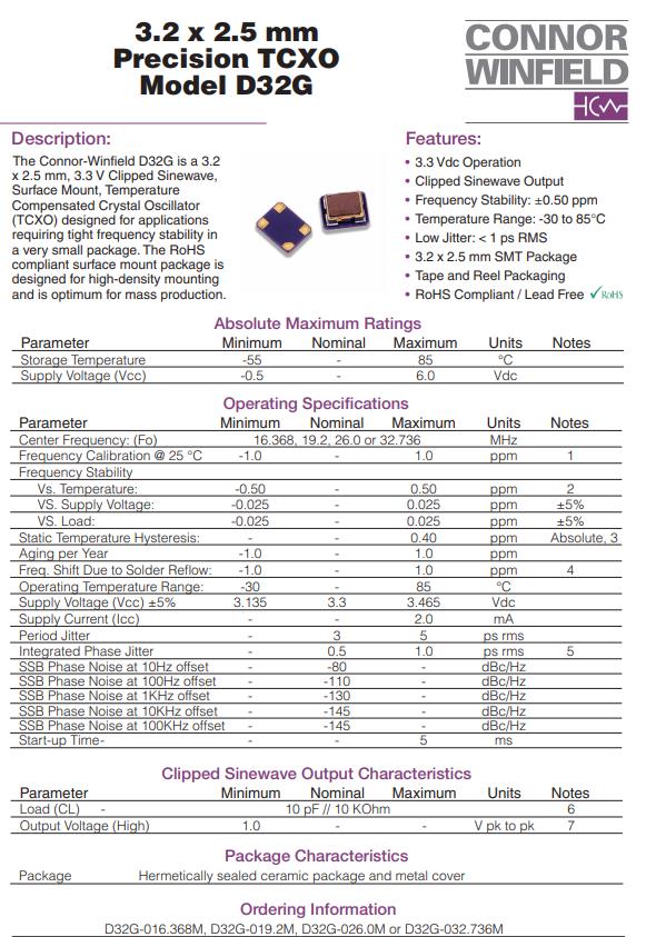 Connor-Winfield D32G是3.2x 2.5 mm, 3.3 V表面掛載、溫補晶振(TCXO)為應用而設計要求高度的頻率穩定性一個非常小的包裹。的RoHS兼容的表面安裝包專為高密度安裝而設計適合批量生產。