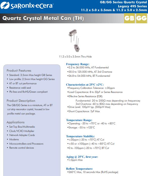 產品特性:標準:3.5mm最大高度GB系列,低外形:最大高度2.5mmGG系列,AT或BT cut性能,電阻焊密封,無鉛,符合RoHS/綠色標準
