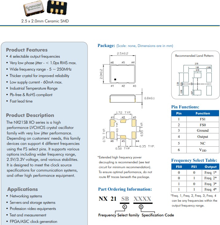 具有極低抖動性能的高性能LVCMOS晶體振蕩器NX21SB XO系列,NX21SBXXXX,小體積尺寸2.5mmx2.0mm貼片振蕩器,CMOS四頻可編程XO,根據客戶的需求,該系列器件可以使用 FS 選擇引腳支持 4 種不同的頻率。它支持多種選擇,包括更寬的頻率范圍、2.5V/3.3V 電壓和各種穩定性。它旨在滿足通信系統和其他高性能設備的時鐘源規范。特征: