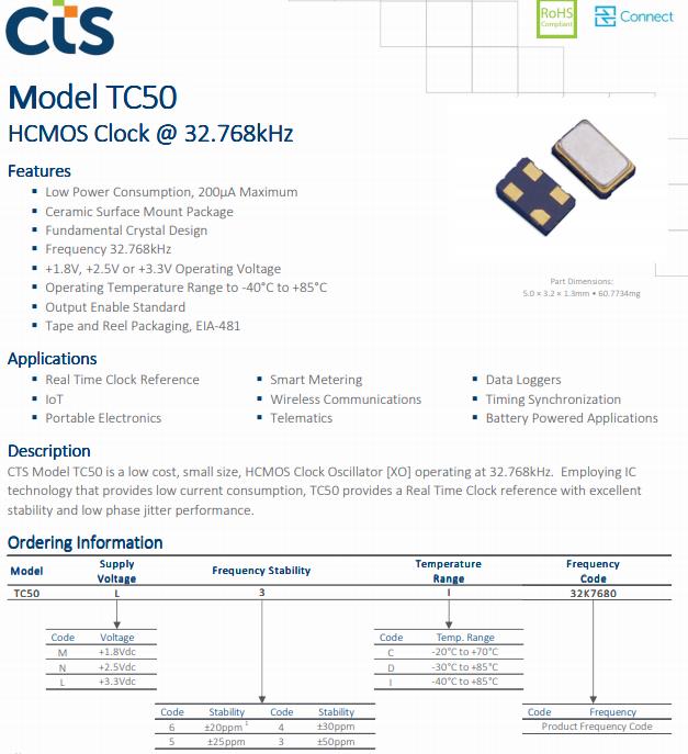 | TC50L5I32K7680 | CTS晶振 | TC50 | 32.768kHz | ±25ppm | 0.197" L x 0.126" W (5.00mm x 3.20mm) |