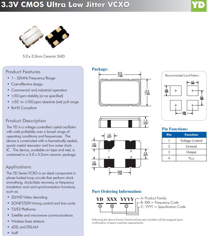 亞陶晶振YD系列是一種壓控晶體振蕩器,在廣泛的工作條件和頻率范圍內具有廣泛的可拉性。該器件由密封的石英晶體諧振器和低噪聲時鐘IC構成。該器件采用卷帶包裝,采用5.0x 3.2mm 陶瓷封裝。YD系列VCXO晶振是執行時鐘平滑、時鐘/數據恢復或頻率轉換和卡同步功能的鎖相環電路中的理想組件。亞陶晶振YD系列由密封的石英晶體諧振器和低噪聲時鐘IC構成,YNWMAX153,5032mm晶振,有源晶振