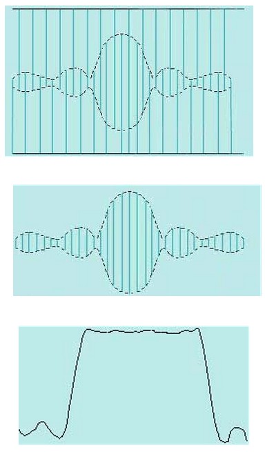 在實際應用中,上述對稱的幅頻特性往往滿足不了要求,所以常常采用不均勻結構,即使叉指電極尺寸和形狀作適當的設計和調整,使幅頻特性滿足特定的要求。如圖2—13所示,使叉指孔徑(重疊)的結構形狀包絡與sinx/x 曲線的形狀相同,即可得到接近矩形形狀的振幅頻率特性。