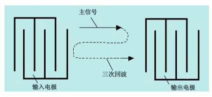 當主信號到達輸出電極時,通過反壓電效應轉換成電信號輸出,然而,此時也可以把輸出電極看成是一個“輸入電極”,于是又通過它的壓電效應把已轉換的電信號的一部分又轉換成聲表面波,向輸入端方向傳送。到達輸入端后,又以相似的形式被反射到輸出端,形成了所謂“三次回波”,如圖2—14所示。當然,同樣的道理,還會再形成5次、7次……(2n-1)次回波。但是和三次回波相比,它們要小得多,所造成的影響也就微不足道了。