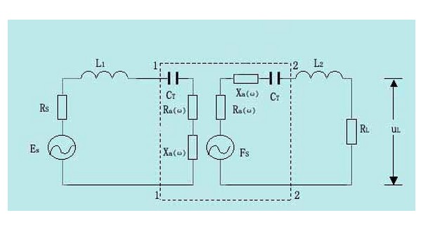圖2—16為聲表面波濾波器的等效電路。圖中us為電信號源;Rs為信號源電阻;Ra(ω)為輻射電阻;Xa(ω)為輻射電抗。Za(ω)=Ra(ω)+jXa(ω)為電能轉換為聲能(機械能)的等效阻抗,與頻率有關;CT為換能器的極間總電容;FS為聲源(即聲強)。為了減小聲表面波濾波器的插入損耗,通常在外電路采用串聯電感的方法(如圖2—16中的L1、L2),使輸入端或輸出端發生串聯諧振,抵消容抗成份,并使Rs= Ra(ω),RL= Ra(ω)。 理論和實踐都證明,輸入端的匹配并不影響表面波濾波器的帶寬,而輸出端的匹配對帶寬的影響也不大,因此,為了抑制三次回波的影響,使輸出端稍有失配是實用的。