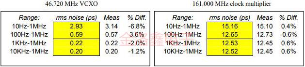 相位噪聲測試系統(tǒng)沿對數(shù)標度繪制頻率,每十年至少應選擇3個點.例如,為了獲得均勻分布的點,我們選擇使用10、20、50、100、200…等方法.點越多,相關(guān)性越好.剩下的就是取求和的平方根,然后除以(2*PI*Fo).我們已經(jīng)描述了使此任務輕松實現(xiàn)以電子表格實現(xiàn)或?qū)⑵渚幋a為BASIC或C程序所需的所有步驟,下面列出了以下結(jié)果,將該方法與Aeroflex PN9000相噪測試儀進行了比較,使用n=16點10Hz至1MHz. [供應商與客戶之間抖動抖動的相關(guān)性]