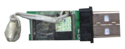 下圖是已經(jīng)修好的優(yōu)盤(pán),因?yàn)楹髶Q的晶振較大,我用細(xì)導(dǎo)線(來(lái)自40線硬盤(pán)傳輸線)引出,并膠帶包裹絕緣后放在尾部,將尾蓋里的塑料稍去掉一點(diǎn)正好可以合上。