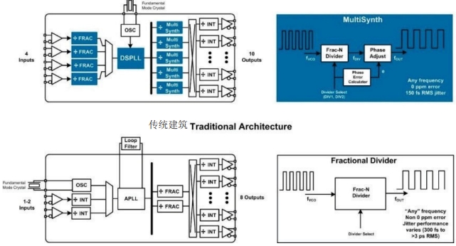 第四代DSPLL與傳統(tǒng)高性能時鐘架構(gòu)Si5345/44/42抖動衰減器利用獨(dú)特的專有架構(gòu),與傳統(tǒng)時鐘架構(gòu)相比,具有更高的頻率靈活性,更低的抖動,更低的相位噪聲和更好的雜散性能.這些新器件采用最先進(jìn)的工藝技術(shù)設(shè)計(jì),適用于任何獨(dú)立的時鐘器件(55納米CMOS),使得在單一統(tǒng)一架構(gòu)中提供無與倫比的性能和頻率合成靈活性成為可能.Si5345支持靈活的輸入級,每個時鐘輸入具有獨(dú)立的小數(shù)分頻器.這種集成簡化了器件與各種不同時鐘源(如BITS,SyncE,SONET/SDH,PDH,ASIC,FPGA)的接口.DSPLL提供抖動衰減,任意頻率轉(zhuǎn)換,無中斷開關(guān)和保持功能.DSPLL將模擬LC-VCO與基于DSP的數(shù)字環(huán)路濾波器和數(shù)字鑒相器相結(jié)合.這種混合混合信號方法提供了兩全其美的優(yōu)勢:在高度集成的數(shù)字可編程架構(gòu)中實(shí)現(xiàn)低相位噪聲和低抖動時鐘合成.環(huán)路濾波器功能集成在片內(nèi),消除了分立濾波器元件,簡化了PCB布局.Si5345器件支持集成快速鎖定特性,無論環(huán)路帶寬設(shè)置如何(<100毫秒),都能實(shí)現(xiàn)極快的PLL采集.除了消除與外部聲表濾波器元件相關(guān)的噪聲耦合之外,DSPLL帶寬在0.1Hz至4kHz范圍內(nèi)可由用戶編程,支持根據(jù)應(yīng)用選擇環(huán)路帶寬,同時將抖動傳遞降至最低.相比之下,大多數(shù)傳統(tǒng)APLL解決方案需要分立環(huán)路濾波器,這種濾波器對電路板級噪聲非常敏感,會影響抖動的產(chǎn)生,并增加PCB布局的復(fù)雜性.5|DSPLL驅(qū)動五個獨(dú)立的多同步小數(shù)分頻器,這些分頻器通過非阻塞式交叉點(diǎn)開關(guān)連接到10路時鐘輸出陣列.在MultiSynth架構(gòu)的第一階段,Skyworks晶振的MultiSynth高速小數(shù)N分頻器在兩個最接近的整數(shù)分頻器值之間無縫切換,以產(chǎn)生精確的輸出時鐘頻率,頻率合成誤差為0ppm.為了消除此過程產(chǎn)生的相位誤差,MultiSynth會計(jì)算小數(shù)N分頻器產(chǎn)生的時鐘與所需輸出時鐘之間的相對相位差,并動態(tài)調(diào)整相位以匹配理想時鐘波形.這種新穎的方法可以產(chǎn)生1kHz至800MHz范圍內(nèi)的任意輸出時鐘頻率,0ppm誤差,同時在整數(shù)模式下實(shí)現(xiàn)優(yōu)于100fsRMS的相位抖動性能(12kHz至20MHz),在合成模式下實(shí)現(xiàn)小于150fs的性能,同時產(chǎn)生小數(shù)和整數(shù)相關(guān)時鐘.相比之下,傳統(tǒng)架構(gòu)依賴不執(zhí)行相位誤差消除的傳統(tǒng)小數(shù)分頻器,因此當(dāng)器件配置為產(chǎn)生小數(shù)輸出時鐘時,輸出抖動明顯更高.
