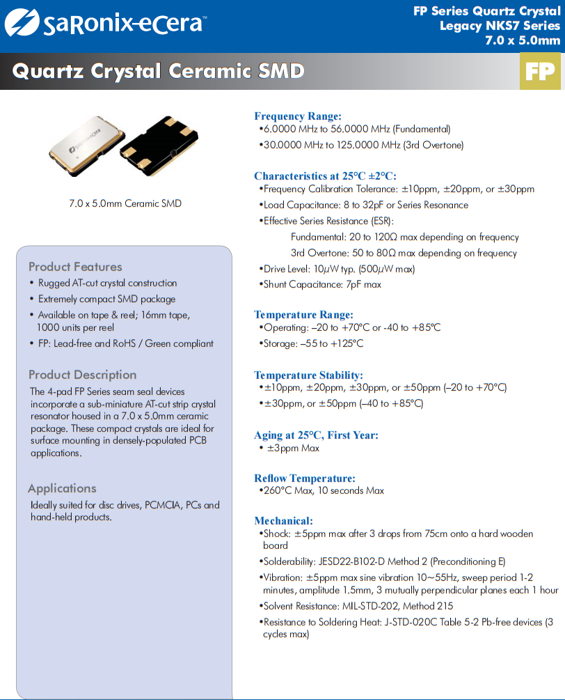 •FP系列接縫密封裝置包括包括一個亞微米結構AT-cut帶狀晶體器件,該器件安裝在7.0 x 5.0mm的集成電路封裝年齡,這些緊湊的晶體是理想的表面安裝在密集的流行,而不是印刷電路板應用程序